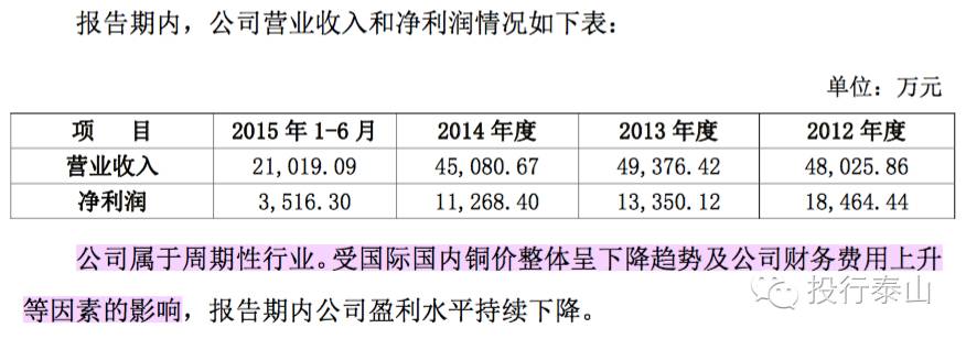 【量化分析上市即亏损的可能性】报告期内公司净利润持续下滑;其中铜价波动是影响公司经营业绩的主要因素,经公司测算,如果按照2015年1-6月的销售规模、成本费用及营业外收入水平,假设仅铜精矿价格变动对公司合并利润总额产生影响,当公司铜精矿平均销售单价(不含税)低于24,919.79元/吨(2015年1-6月公司铜精矿平均销售单价不含税为32,948.95元/吨)时,公司上市当年将可能出现亏损。注:泰山认为这种可能性几乎没有,但量化分析符合证监会对于风险提示的信息披露导向(四川里伍铜业IPO)