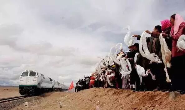 青藏铁路通车 2006年7月1日,当地群众在西藏沱沱河大桥桥头,欢迎入藏列车。青藏铁路全线通车标志着西藏结束了不通火车的历史,促进当地经济发展。