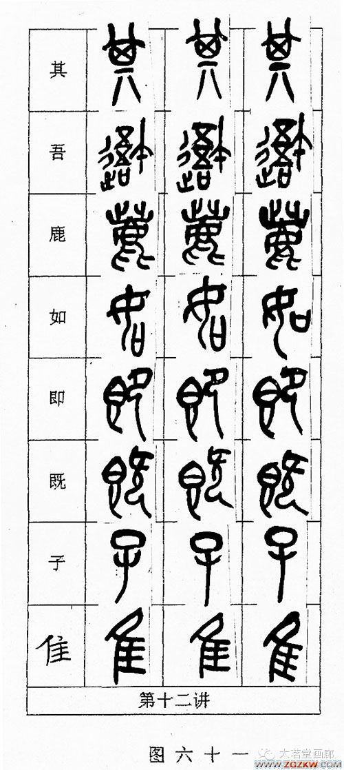 3、同字异形处理。篆书笔画没有楷书多,而结字大小变化也不象行书那要那么方便,不可过于悬殊,因而同字异形处理难度大。吴昌硕主要通过结构移位、笔画粗细和改变弧度来实现。《石鼓文》中“其”字出现的最多,有23个,每个皆有不同变化,图六十一中各字变化中可见证吴昌硕的匠心独运。