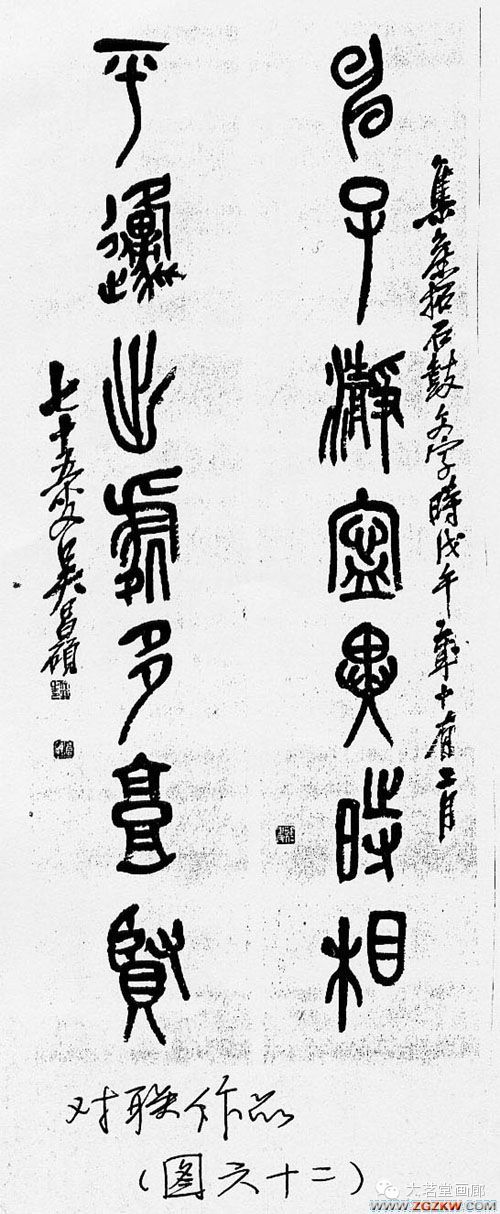 2、部首处理。偏旁相同和结构对称在篆书中很多,吴昌硕主要通过错位来打破平正,实现字体生动性的突破,可分为两类: