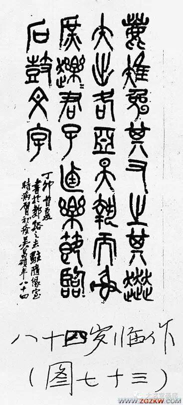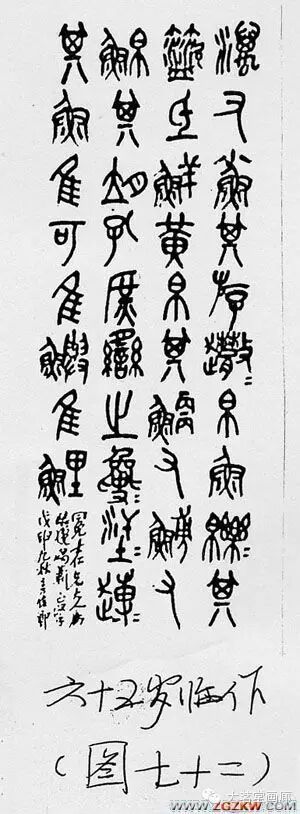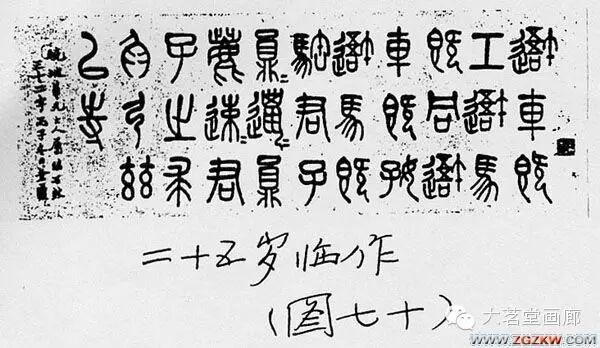 1、“百炼钢化为绕指柔”的勤奋。图七十为25岁临作,图七十一为46岁所作,图七十二为65岁所作,图七十三为暮年84岁作,自25岁到84岁的近六十年的时间里,《石鼓文》学习贯穿他整个书法生涯,所谓“一日不临,自觉少意”。通过勤奋实践,将技法荟萃于胸。