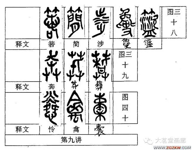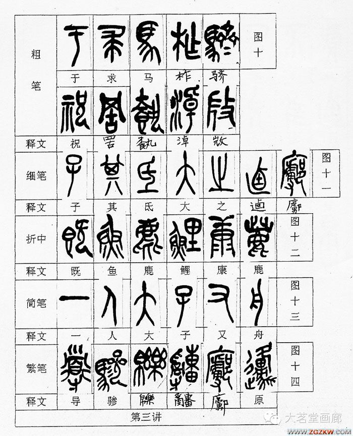 从第四讲到第九讲,着重分析的是吴派石鼓结构特点,有两点要加以说明,一是所谓的结构主要从篆书形态上来划分,而不是从楷书标准,两者有重合的地方,也有不同的地方;二是这些规律体现了吴昌硕的追求目标,让静态篆书飞动起来,因而也是临习吴派石鼓要最注重体会的。