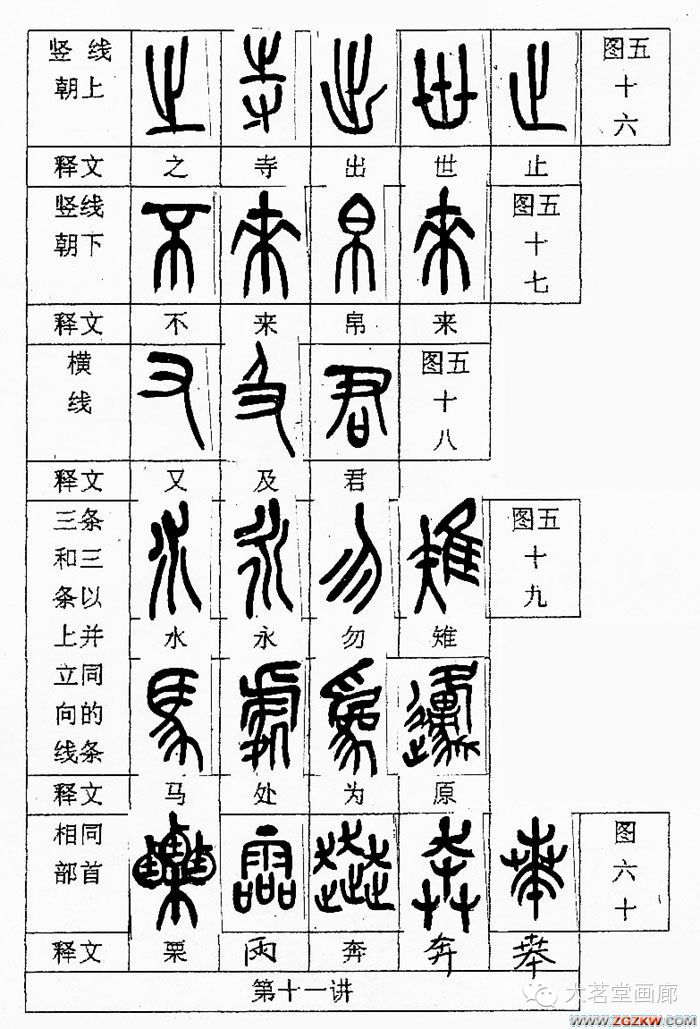③横线同向朝左。图五十八中“又”、“及”、“”一般中间缩进,上下伸出,在用笔粗细上有一些变化;