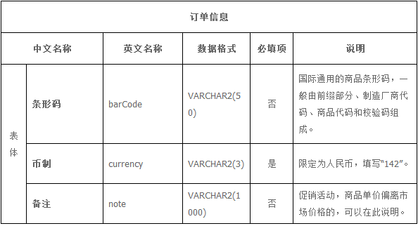 2.跨境电子商务零售进口订单推送至跨境电子商务通关服务平台(进口)接口报文表体中增加“条形码”、“币制”、“备注”字段。