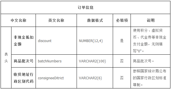 1.跨境电子商务零售进口订单推送至跨境电商通关服务平台(进口)接口报文表头中增加“非现金抵扣金额”、“商品批次号”、“收货地址行政区划代码”字段。