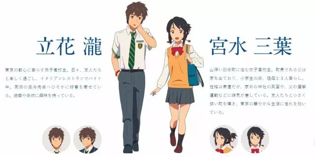 《你的名字》的主人公依旧是新海诚作品中常见的少年少女。家住东京都的高中男生立花泷与生活在乡村的的高中女生宫水三叶上演了一个关于邂逅的故事,只不过这一次的邂逅发生在梦中。