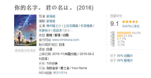 豆瓣电影上的《你的名字》高达9.1分,这不禁让小编对这部电影的期待值又上升了不止一个度。