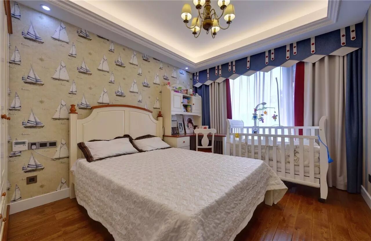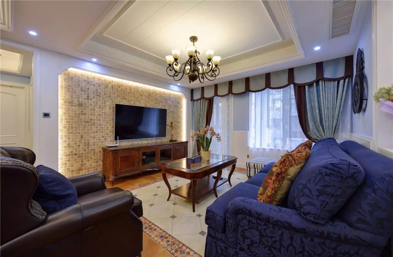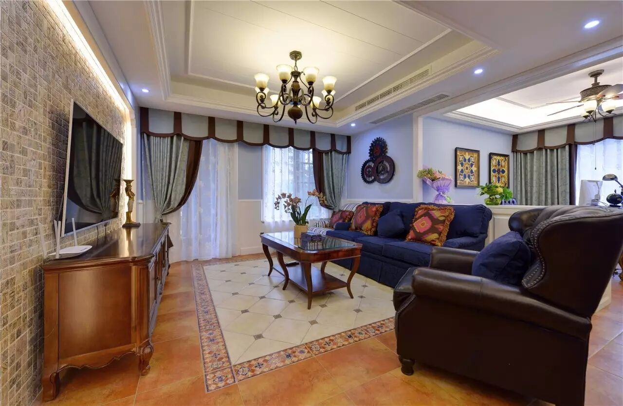 本案是以典型美式风格为主调的一个户型。客厅以浅蓝色,黄色,白色为基调。