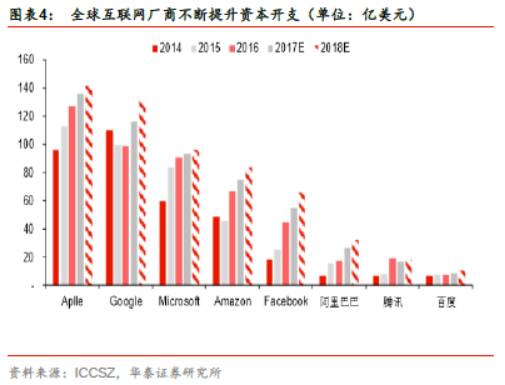 互联网厂商不断提高资本开支,光互联投资比重提升至20%。来自DCDi(Datacenter Dynamics Intelligence)数据显示,2015年数据中心投资达到1844亿美元,到2020年全球数据中心投资将达到2834亿美元。数据中心内部光电互联通信需求日益重要,相关投资占数据中心总投资比重已经从 8-12%提升至20%左右。云计算和数据中心方面,美国 TOP4 ICPs(Amazon、Google、Facebook和Microsoft)的光模块需求近年来出现了明显的提升,市场开始不断上调对于数据中心光模块需求的预期。
