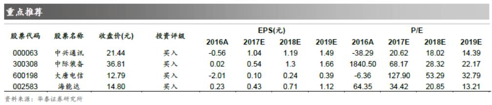 2017年公司运营商业务将受益于欧洲市场的份额增加和传输网建设投资的增长。公司在政企业务方面拥有从智慧城市工程总包到NB-IoT芯片生产的产业链整合能力,拥有打造智慧城市标杆银川的成功经验。2016年公司获得PCT国际专利申请全球第一,领先于华为、高通等国际巨头。公司累积5G专利申请已超过1500件,首创Pre5G Massive MIMO基站已在中国、日本实现规模商用。2017年公司成功推出基于FDD制式Massive MIMO产品,在全球最广泛的FDD LTE网络5G市场锁定技术优势。近期海外5G落地加速,倒 逼国内5G加快节奏,公司5G业务业绩确定性不断增强且有望提前释放,提前布局时点 显现。我们预计公司17-19年净利润 43.5/49.8/62.4 亿元,重申“买入”评级。