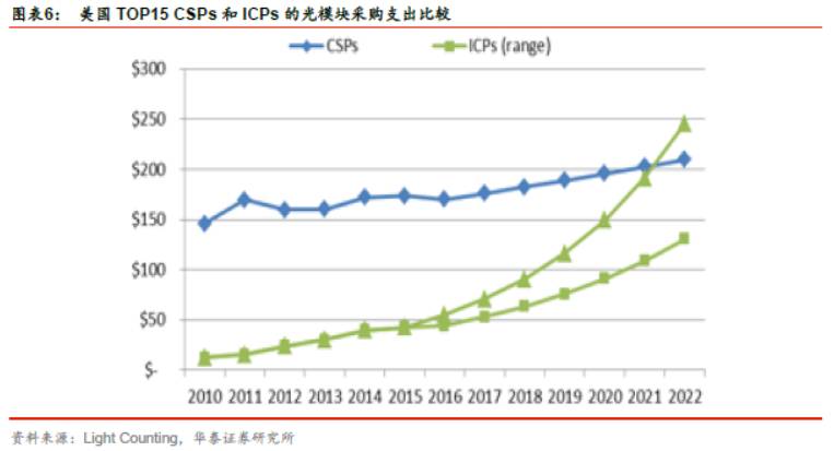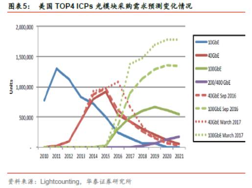 未来光模块采购以ICPs为主。美国市场整体光模块采购支出以CSPs为主,但是2015年起,随着云计算巨头发力和数据中心光模块产品高端化,ICPs的光模块采购支出开始快速增长,逐步缩小与CSPs的差距,或将于2021年前后与前者平分秋色。市场研究公司LightCounting最新的以太网光模块市场报告表示Amazon、Google、Facebook和Microsoft等主要互联网公司的数据中心光模块采购金额将从2016年的5亿美元增长到2017年的10亿美元,到2022年这一市场还将翻倍,占同类光模块市场的30%。