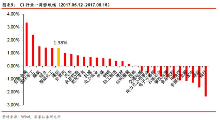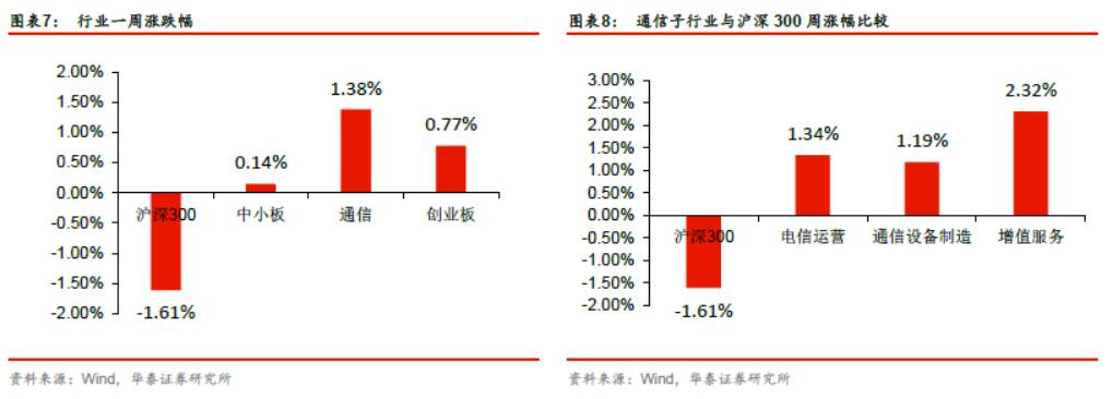 通信行业周涨幅1.38%,同期沪深300下跌1.19%,中小板指上涨0.76%,创业板指数上涨0.85%。通信板块107只股票中14只停牌,65只上涨,28只下跌。