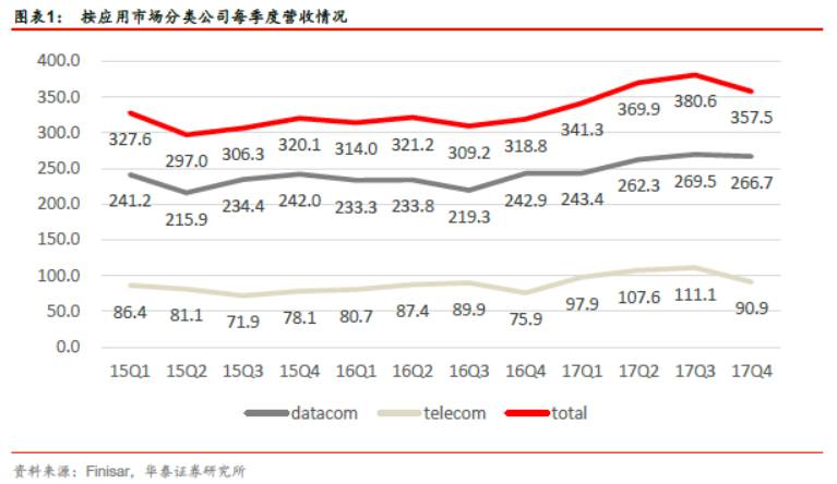 公司未来将加大QSFP28产能,2018Q2业绩将反弹。数通市场方面公司认为数据中心100G QSFP28缺口仍然很大,供小于求的局面将持续到2018年,公司也在不断扩大产能,预计2017年第四季度产能释放。公司QSFP28产品中销售收入最大的是LR4其次是CWDM4,但CWDM4的销量较大。虽然中国地区营收下降,但公司对2018财年有信心,预计2018财年Q2业绩会有反弹,主要是因为超大数据中心建设提升100G QSFP28需求以及3D Sensing用VCSEl也会贡献业绩。