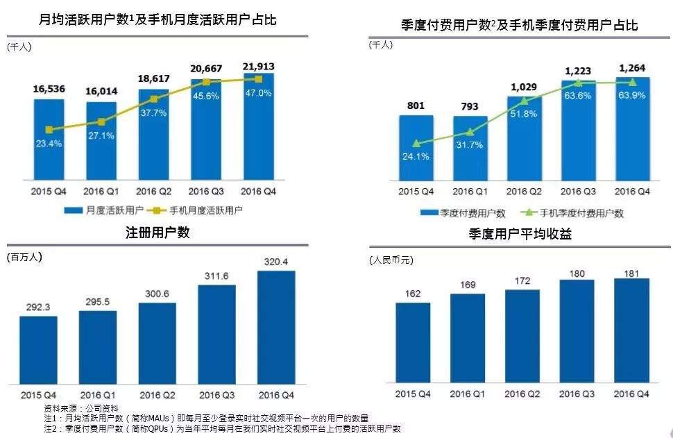 尽管如此,用户数据方面显示出来的信息也还是很可喜的。天鸽互动2016年的月活用户为2191.3万人,同比增长32.5%。季度付费用户同比去年增长57.8%至126.4万人,ARPU为181元。用户增长数字自然是无法与一些大的直播平台相比,但可贵的是在用户仍保持高速增长的状况下,付费用户和收入也同时保持高增长速度。从财报给人的感觉来看,天鸽互动是真正把握住秀场直播业务脉搏的一家公司。