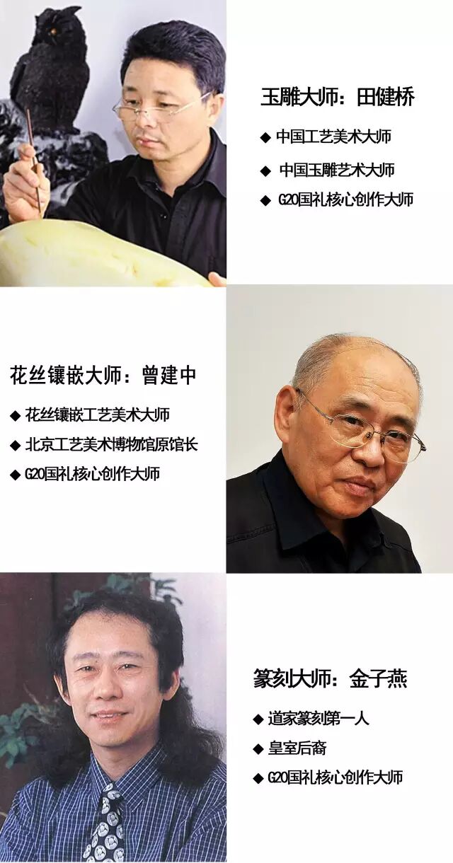 据悉G20峰会国礼玉玺《四海升平财玺》套装系列是北京工美集团近年来少有的经典大制作,将历年国礼工艺集于一身,是首方宫廷传统花丝镶嵌、玉雕、錾刻工艺结合的玉玺。它采用了上等和田玉为原料,采用玉雕、花丝镶嵌、錾刻等传统工艺,精工细作,由玉雕中国工艺美术大师田健桥、花丝镶嵌工艺美术大师、原北京工艺美术博物馆馆长曾建中、道家篆刻第一人 、皇室后裔金子燕创作而成。此套《四海升平财玺》作品寓意四海升平,金玉满堂。此印设计灵感来源于洛书九宫排布,根据G20峰会本身为经济论坛,又取8的谐音发,设置8个篆书财字,整体以大气规整为优先考虑设立,8个财字更有谐音“发财”,表达了中方对世界经济建设的美好愿景。