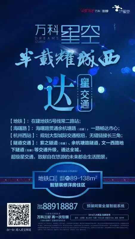 万科星空是作为杭州万科十年首入未来科技城的代表性作品。【万科•星空】身居未来科技城硅谷学院居住区,对望一座城市的硅谷精神,以规划约6.5万方建筑面积,配合“科技人文”理念,将全面实践智慧社区和地铁住宅的全新主张。以建筑面积约89-138㎡科技人文住品,致敬“天堂硅谷”每一个改变世界的梦想。