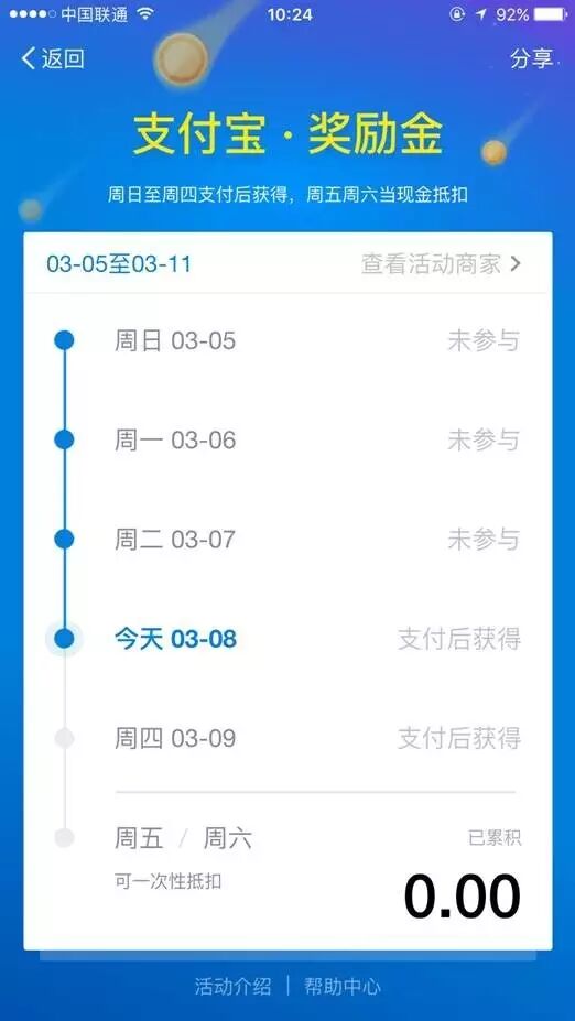 每周日至周四,支付宝每天将发放1000万份奖励金,用户先到先得,使用花呗余额宝付款,奖励金还将翻倍,最高999元。支付宝表示,接下来3个月时间里,希望通过“奖励金”,鼓励更多人体验无现金生活,培养无现金使用习惯,推动中国进入无现金社会。