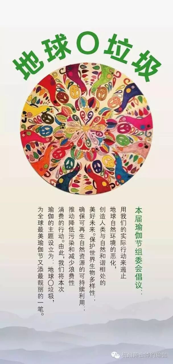 今年,本届瑜伽节组委会倡议:用我们的实际行动来遏止地球自然环境的恶化,创造人类与自然和谐相处的美好未来。保护世界生物多样性;确保可再生自然资源的可持续利用;推动降低污染和减少浪费性消费的行动。由此,我们将本次瑜伽的主题设立为:地球〇垃圾,为全球最美瑜伽节又添最靓丽的一笔。