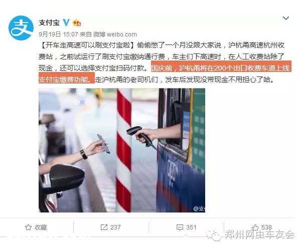 2016年9月19日,支付宝官方微博发出消息称:开车走高速可以刷支付宝啦!并且国庆前沪杭甬将在200个收费车道上线支付宝缴费功能,这对于高速的老司机们而言,无疑多了一个缴费的快捷方式,提高了通行效率。