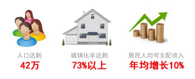 居民:区域常住人口达到42万人,户籍人口城镇化率达到73%以上,未来五年内居民人均可支配收入年均增长10%。
