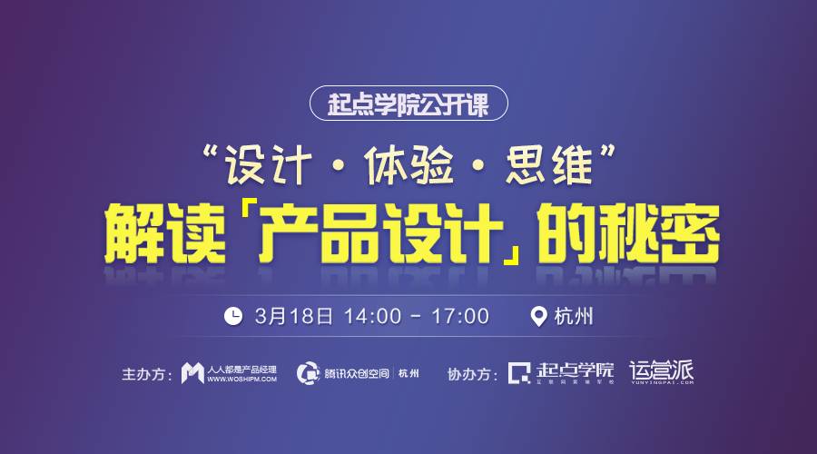 3月18日(周六),起点学院公开课(杭州站)邀请了阿里巴巴菜鸟网络资深交互设计师程萍、前阿里巴巴资深产品经理蔡宇、前阿里巴巴产品经理Justin、《绝密原型档案》作者Gara,他们将从设计、体验、思维等多维度,深入聊聊产品设计背后的思考。四位实战派,不一样的思维,能碰撞出怎样的火花呢?来了你就知道啦!