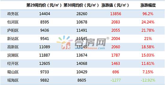 在看各区,除了除瑶海区外,其他8个区均价都在万元以上,政务区更是高达28260元/㎡,主要是因为政务区本周只有2套置地广场的别墅备案,拉高到了区域的整体均价。