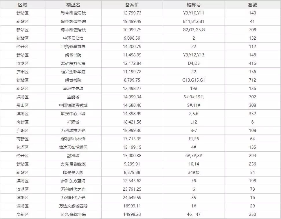九区中有8个区域本周均价有所上涨,分别为政务区、包河区、庐阳区、新站区、高新区、滨湖区、经开区和蜀山区,涨幅最大的为政务区,环比上周涨幅为96.2%,其次为包河区,较上周涨幅为24.24%,蜀山区涨幅最小,涨幅为7.15%;九区中只有瑶海区本周均价有所下降,环比上周下降12.92%,这与本周瑶海区只有4套住宅备案,且有2套文一名门皇马的备案均价在6521元/㎡有关。