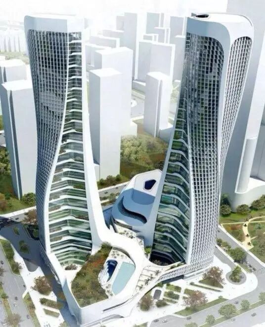 杭州来福士中心位于杭州钱江新城CBD核心位置,虽然设计理念源于钱塘潮、不过同图上看里江河湖海还是有一定距离。这样的双塔建筑也被杭州网友戏称为“杭州的大裤衩”。不过设计师的理念是这样的——将借涌潮现象的优美曲线及层层相迭的自然形态,以现代美学的表现手法,展示出与周边环境相呼应的建筑形态。
