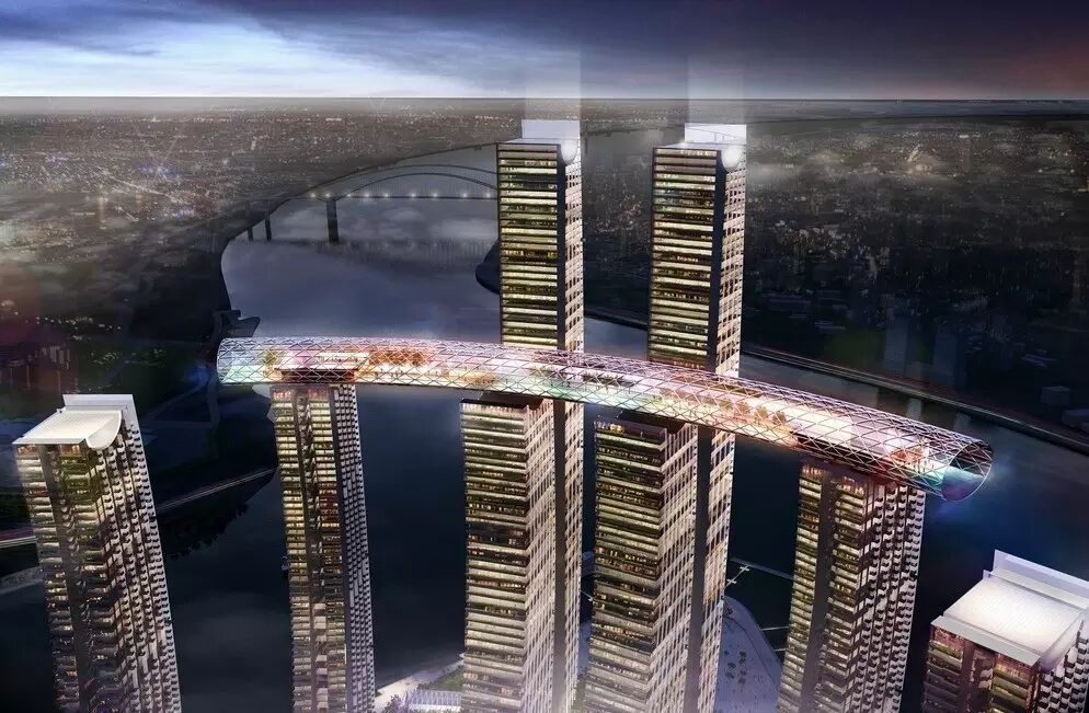 从意境图上看,重庆来福士广场最亮眼之处要数其水晶廊桥的设计。和常见的廊桥一连接就成“裤衩”的谜之尴尬不同,这座水晶廊桥能连接的建筑数量更多、造型上也充当着整座帆船型建筑上的横杆,十分漂亮、乘风破浪、迎风起航才更有气势。