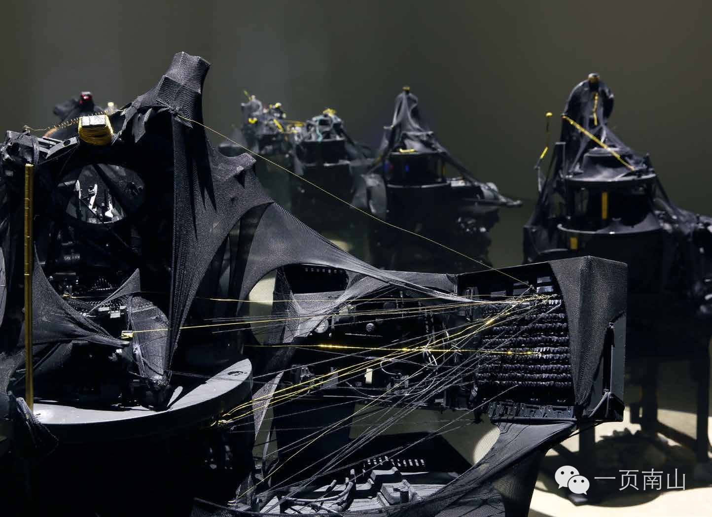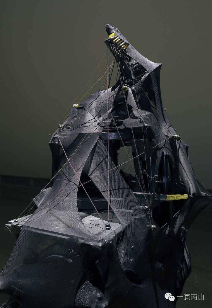 许江&袁柳军,山水离歌,金属、弹力织物、金属线,65cm×50cm×145cm×24,2016