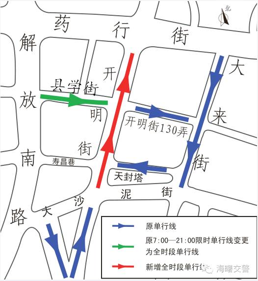 自2016年9月21日(周三)起,全天禁止所有机动车在县学街(解放南路-开明街)由东往西通行。全天禁止所有机动车在开明街(药行街-大沙泥街)由北往南通行。