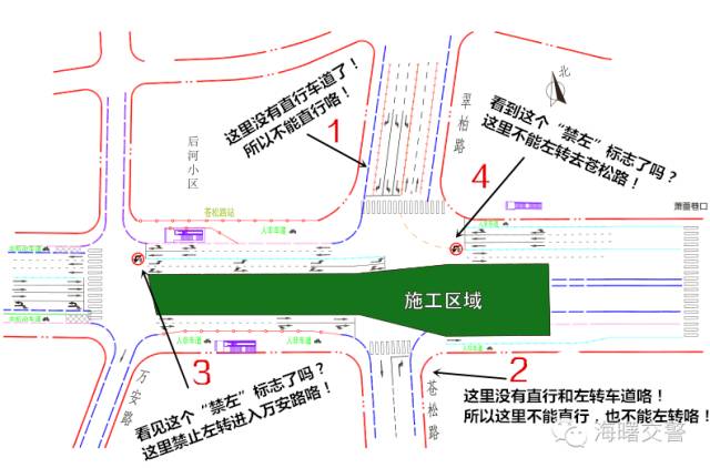 1、0:00-24:00禁止一切车辆在翠柏路由北往南直行驶入苍松路。