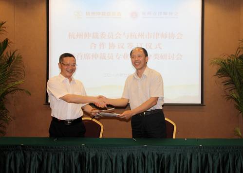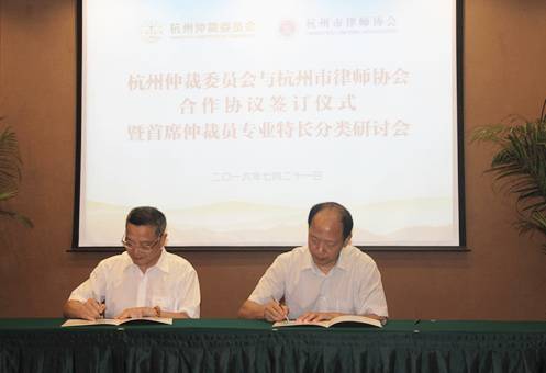 2016年7月21日上午,杭州仲裁委员会与杭州市律师协会合作协议签订仪式暨首席仲裁员专业特长分类研讨会在浙江梅地亚宾馆举行。、省政府参事郑志耿,,、陈桓,杭州律协会长沈田丰,,、余素珍及部分首席仲裁员律师代表出席会议,。