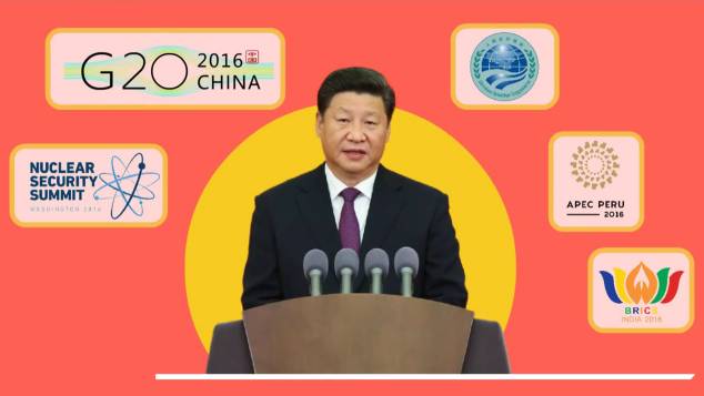 2016年,、上合组织峰会、二十国集团峰会、金砖峰会、亚太经合组织峰会),为世界安全、为全球治理,阐述“中国方案”,贡献“中国智慧”。