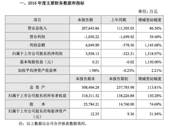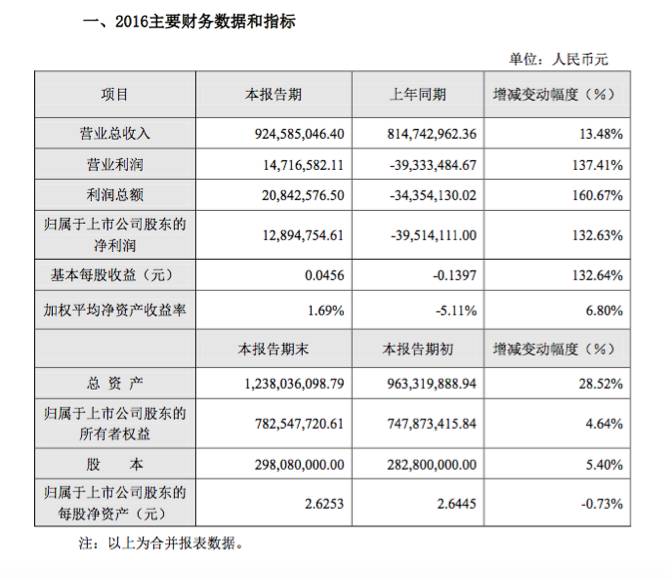 首先让我们一起来看下涨幅最大的好想你。根据报告显示,好想你在2016年度营业总收入达到了20.76亿元,与上年同期相比上涨了85.56%;而利润总额更是暴涨十倍,涨幅达到了1145.68%,共计6049.89万元;虽然营业利润仍然有着1000万余元的亏损,但是较去年相比已经增长了39.4%。