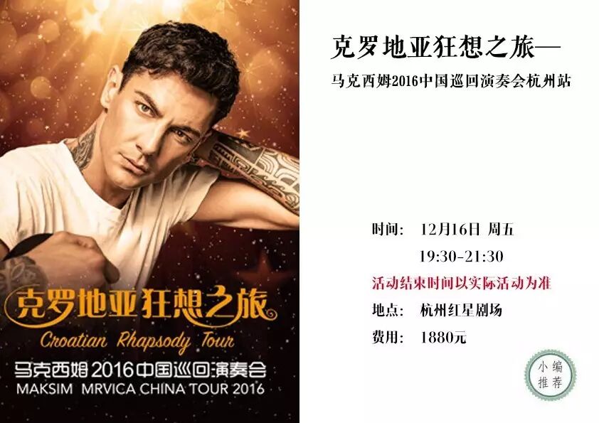 钢琴家马克西姆的中国巡演“克罗地亚狂想曲演奏会”也值得一去。这位钢琴家外表英俊、造型时尚,还是个电子钢琴演奏天才。他特立独行,喜欢将古典曲目与现代元素结合,常常穿一身狂野劲装,像极了流行偶像歌手。迷妹们可以骚动起来了……