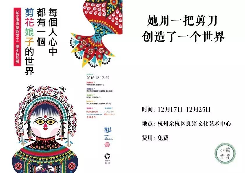 小编首推陕西“剪花娘子”库淑兰的剪纸展。今年12月是库淑兰逝世12周年的日子,此次展览将展出她的部分绝世原作和设计衍生品。库淑兰将原始民俗题材和个人体验融合,剪出的作品五彩斑斓、形象饱满。她原本只是一个普通农妇,看过这个展,相信会让你为凡人迸发的巨大能量而震撼。