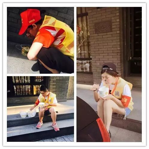 条件艰苦,辛苦的“小黄人”们只能在漂浮着灰尘的路边补充能量......