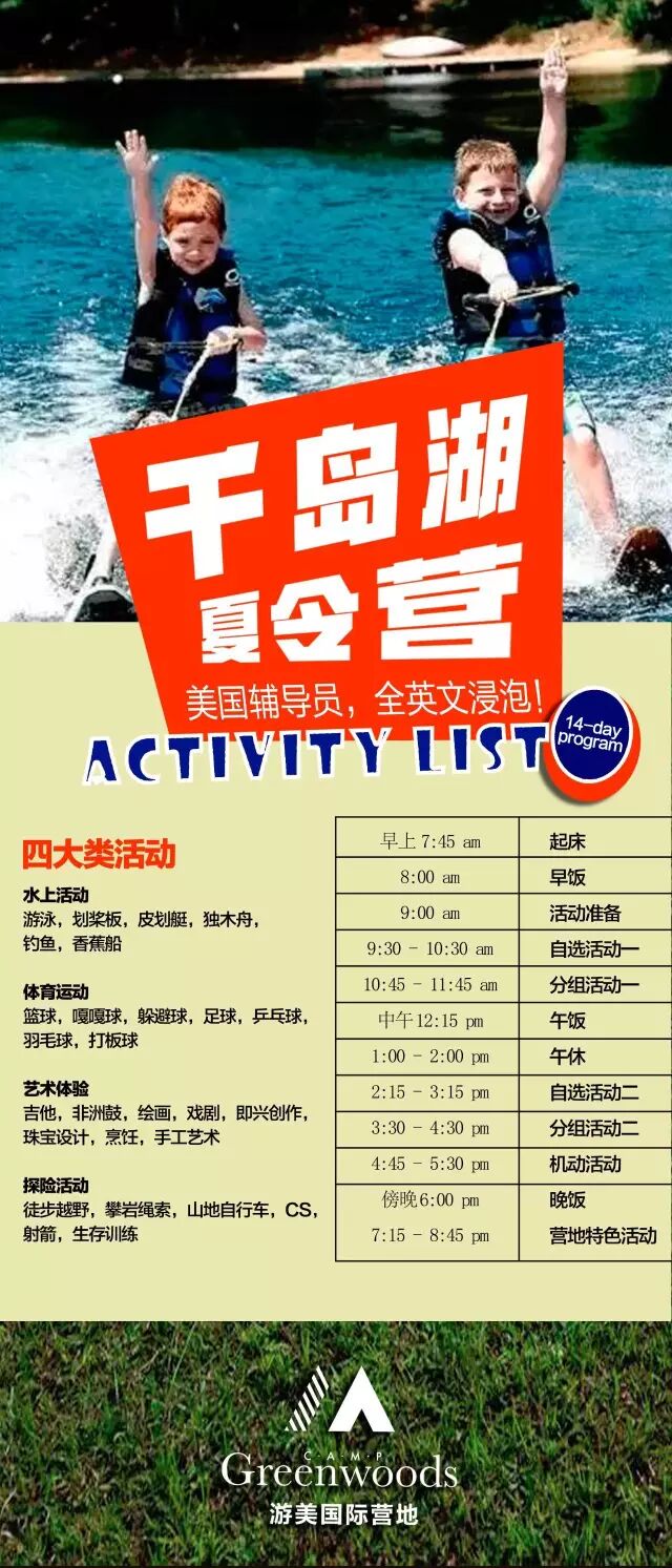 为了满足家长和营员对单周营地的强烈需求,游美千岛湖营地决定新推两期单周体验营项目,每期仅限20人。