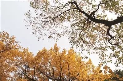 @秋意渐浓,孤山上的银杏叶,把天空分成黄绿两半