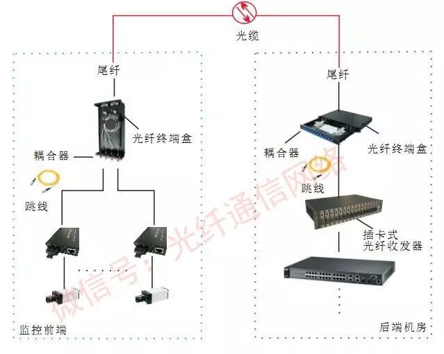 尾纤: 用在终端盒里, 连接光缆中的光纤, 通过终端盒耦合器 (适配器),连接尾纤和跳线。
