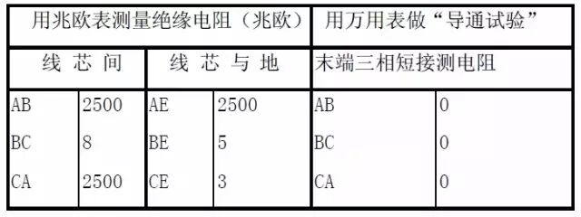 测量绝缘电阻时,使用兆欧表(1千伏以下的电缆,用1000伏的兆欧表;1千伏以上的电缆,用2500伏的兆欧表)来测量电缆线芯之间和线芯对地的绝缘电阻;进行“导通试验”时,将电缆的末端三相短接,用万用表在电缆的首端测量芯线之间的电阻。现将一故障电缆的测量结果列于表2中,供参考。