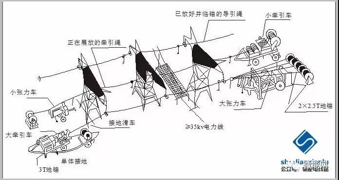 张力放线利用人工或飞行器具展放导引绳(轻质细线)穿过悬挂在杆塔横担上(绝缘子串下方)的放线滑车,实现放线施工段内导引绳首尾相连;导引绳一端与小牵引机连接,另一端与经过小张力机张力展放的牵引绳连接,利用小牵引机牵引导引绳并牵放牵引绳,并由牵引绳替换导引绳(根住牵引力可多次替换);同理,牵引绳一端与经过大张力机张力展放的导线连接,另一端与大牵引机连接,利用大牵引机牵引牵引绳并牵放导线(多种牵引方式);实现放线施工段内导线首尾相连并锚固,等待紧线。