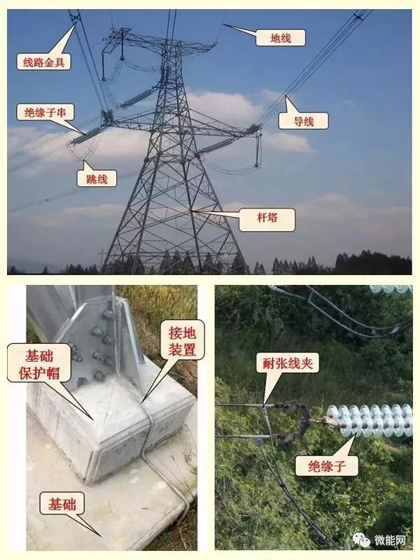 一般输电线路设施包括:基础、杆塔、金具、绝缘子、导线、地线(含OPGW光缆)、接地设施等部分。