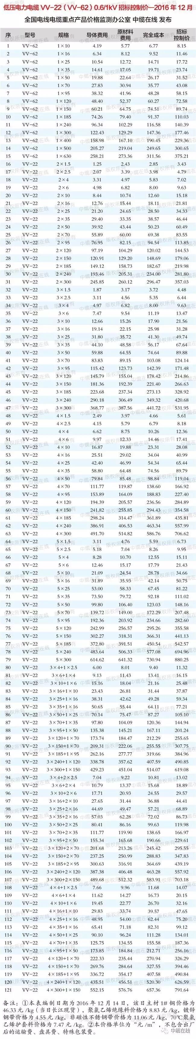 ※本系列低压电力电缆招标控制价由全国电线电缆重点产品价格监测办公室和中缆在线联合发布,每月更新一次,其它型号规格可关注中缆在线微信或登录http://jiage.dianlan.cn进行查询。