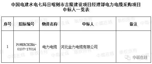 机电网讯 中国电建水电七局日喀则市吉隆建设项目经理部电力电缆采购项目评标工作已经结束,中标人已公示。