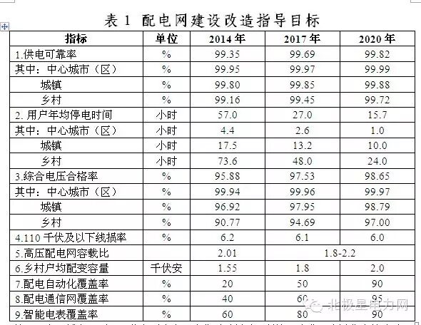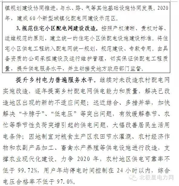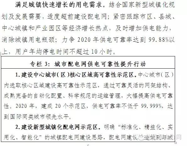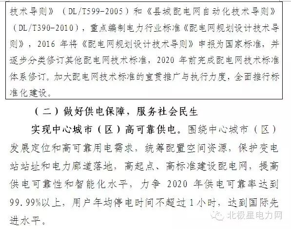 到2020年,中心城市(区)智能化建设和应用水平大幅提高,供电可靠率达到99.99%,用户年均停电时间不超过1小时,供电质量达到国际先进水平;城镇地区供电能力及供电安全水平显著提升,供电可靠率达到99.88%以上,用户年均停电时间不超过10小时,保障地区经济社会快速发展;乡村及偏远地区全面解决电网薄弱问题,基本消除长期“低电压”,户均配变容量不低于2千伏安,有效保障民生。