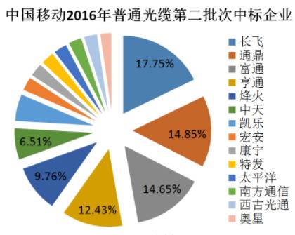 具体中标数额如下,长飞光纤光缆股份有限公司(17.75%);通鼎互联信息股份有限公司(14.85%);杭州富通通信技术股份有限公司(14.65%);江苏亨通光电股份有限公司(12.43%);烽火通信科技股份有限公司(9.76%);江苏中天科技股份有限公司(6.51%);湖北凯乐科技股份有限公司(5.59%);宏安集团有限公司(2.80%);成都康宁光缆有限公司(2.72%);深圳市特发信息股份有限公司(2.66%);山东太平洋光纤光缆有限公司(2.66%);江苏南方通信科技有限公司(2.66%);西安西古光通信有限公司(2.66%);汕头高新区奥星光通信设备有限公司(2.30%)。