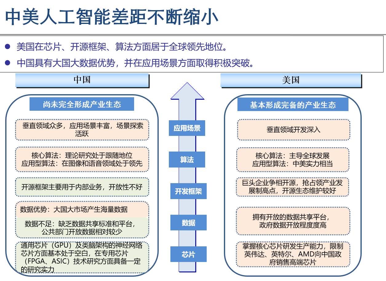 理解大数据的发展,首先要理解人工智能的发展;我们可以看到中美的人工智能各有领先的优势;美国强在芯片、开源框架等,中国强在应用场景,大国大数据的优势;未来中国人工智能的发展大数据的领先优势将持续保持并扩大,这也是国家重视大数据发展的原因;